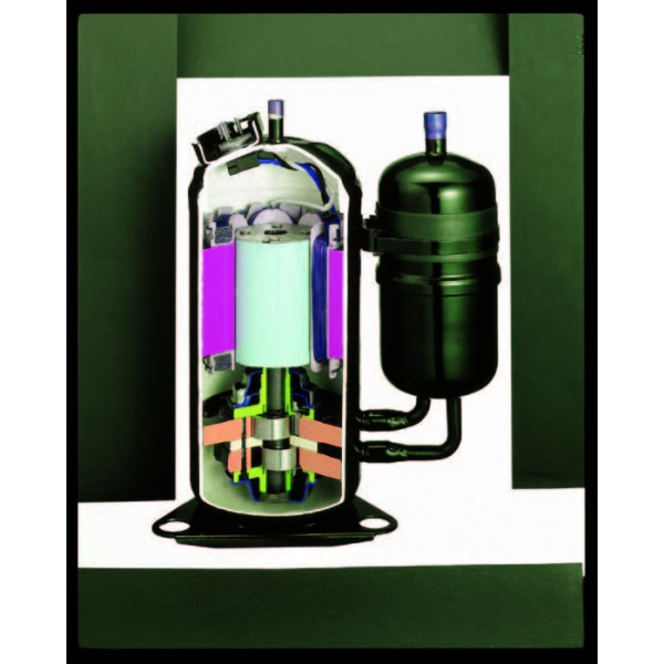 Διπλός περιστροφικός συμπιεστής: Δύο περιστροφικοί κύλινδροι συμπίεσης με διαφορά φάσης 180° και κινητήρας DC συνεχούς ρεύματος με άριστα ζυγοσταθμισμένο άξονα.