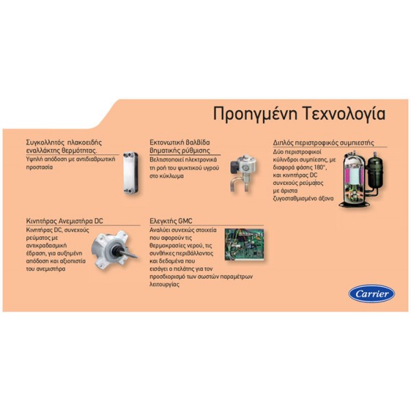 Οι μονάδες DC Inverter της Carrier προσφέρουν μεγαλύτερη αξιοπιστία και βελτιστοποιημένη ενεργειακή απόδοση, από 20% εώς και 120% σε σχέση με την ανομαστική θερμαντική του ισχύ.